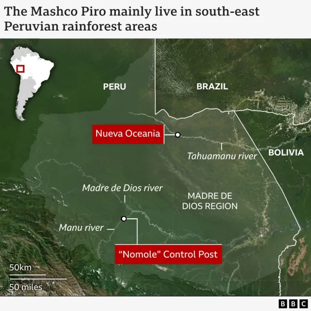 Quase 200 km a sudeste, do outro lado da densa floresta, a situação é bem diferente. Ali, às margens do rio Manu, vivem os Mashco Piro em uma área oficialmente reconhecida como reserva florestal.